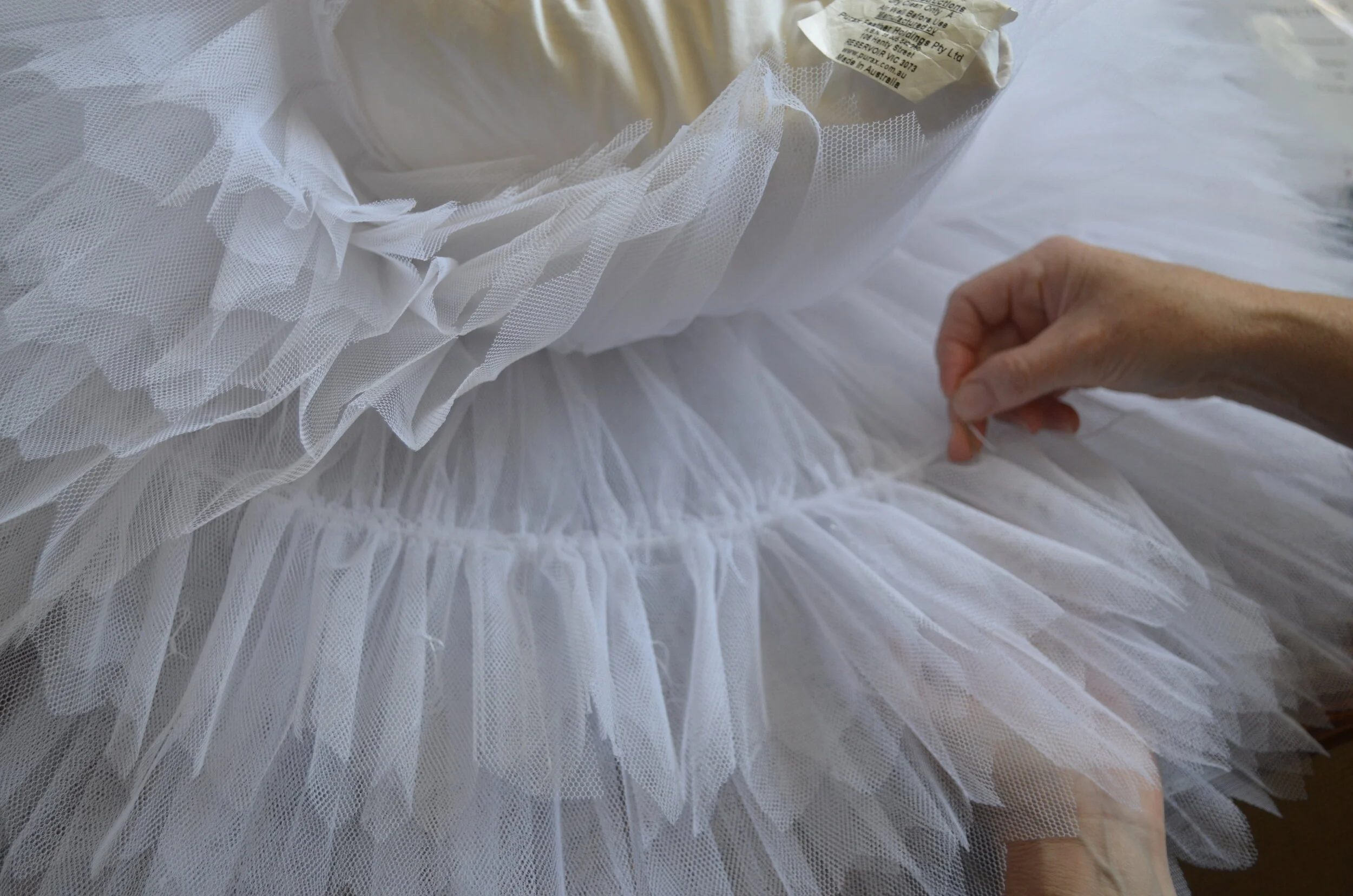 The performance tutu comes in different types, romantic, bell, platter, and classic referred to as pancake. There are ten layers of net in a performance tutu and they are hand-stitched in the Russian technique. Performance tutus comprise of three parts the bodice, basque (pantie), and the frills. Between 20 - 30 measurements are taken to construct a tutu. This can be done online if required. Then a toile (early version of finished garment) can be produced before the final tutu is constructed. A fully decorated finished tutu made to fit takes 60 - 65 hours to make, with a lead time of four to six weeks. Tulle Row performance tutus range in price from $900.